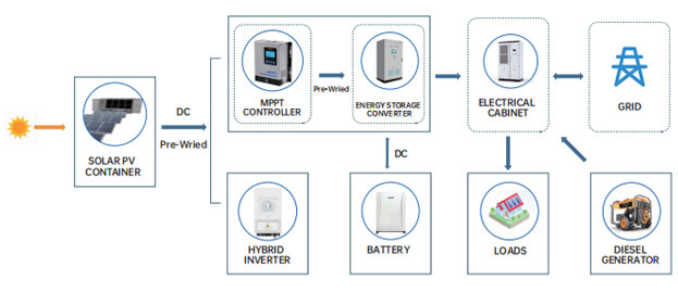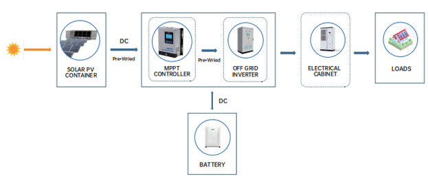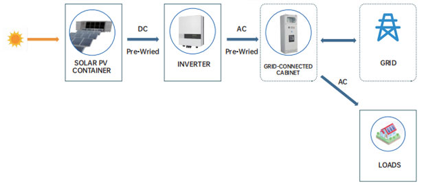 Dòng điện một chiều do mô-đun năng lượng mặt trời tạo ra được biến tần chuyển đổi thành dòng điện xoay chiều, sau đó được cung cấp cho tải và kết nối với lưới điện. Bằng cách này, vừa đáp ứng nhu cầu sử dụng của hộ gia đình, lượng điện dư thừa cũng có thể được bán vào lưới điện.